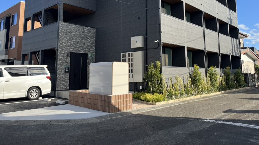 駐車場舗装、インターロッキング、花壇、ダストピット設置を施工しました。